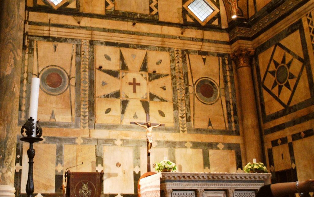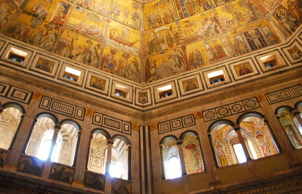 The Duomo Baptistry in Florence is an unassuming building on the outside, but it has an inside that is well worth seeing. Apart from the patterned marble work, the only other feature of note on the outside are the 3 sets of doors. The East doors are of particular note. They’re known as the Gates of Paradise and consist of images displayed on bronze panels. Whilst tourists queue up to get a photo, bear in mind that they’re photographing replicas as the original doors are actually housed in the Duomo Museum.