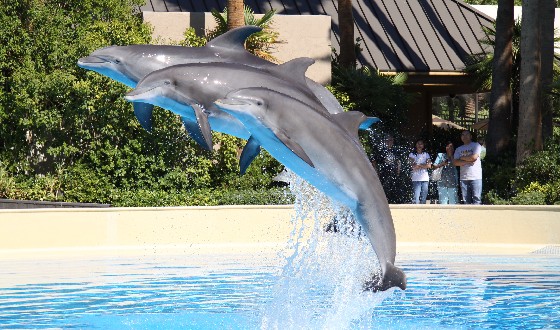 The Mirage – Two attractions we’d recommend here. The volcano outside “erupts” with fire, water and light every night on the hour from 8pm. It’s well worth seeing and last around 5 minutes. At the rear of the hotel though is Siegfried and Roy’s Secret Garden which is a sort of mini animal park. We will remember the dolphins here for a long time to come. This is the closest we have ever been to them and they have lots of pools to swim in. There are no “shows” as these are not “performing” animals, but at most times of the day the trainers are interacting with the dolphins, so there’s plenty to see.