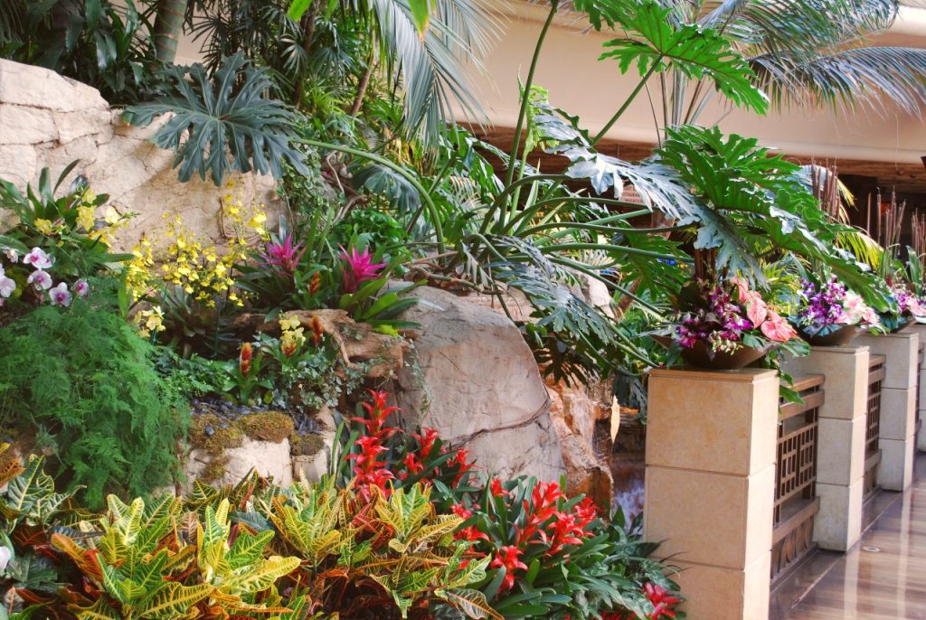Whilst you’re at the Mirage, check out the huge aquarium behind the front desk – it’s 53 feet long and crammed with vibrant coloured salt water fish. At last count the hotel says there are almost 1000 of them!Also take a quick stroll through the indoor atrium which is supposed to represent a lush indoor rain forest (pictured above). It’s all placed under a glass dome and has palm trees and tropical flower arrangements which are looked after by 4 full time gardeners.