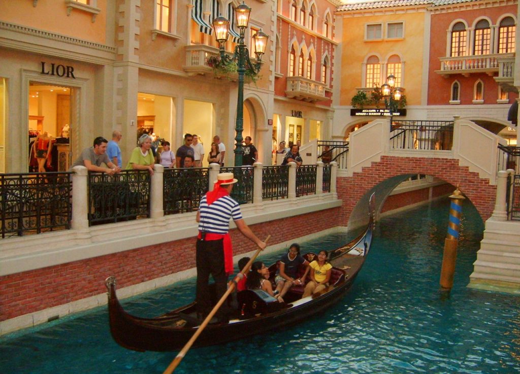 The Venetian Hotel & Casino in Las Vegas has lots of features to remind you of Venice. The hotel frontage includes the architecture of the Doge’s palace and there are waterways with gondolas standing in the shadow of a reconstructed St Mark’s Campanile and crossed by a fake Rialto Bridge. The theme continues inside with a version of the Grand Canal (pictured below) and lots of Italian shops and restaurants. The atmosphere is fantastic and we enjoyed strolling along side the canal and watching the gondolas.