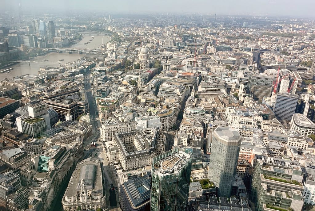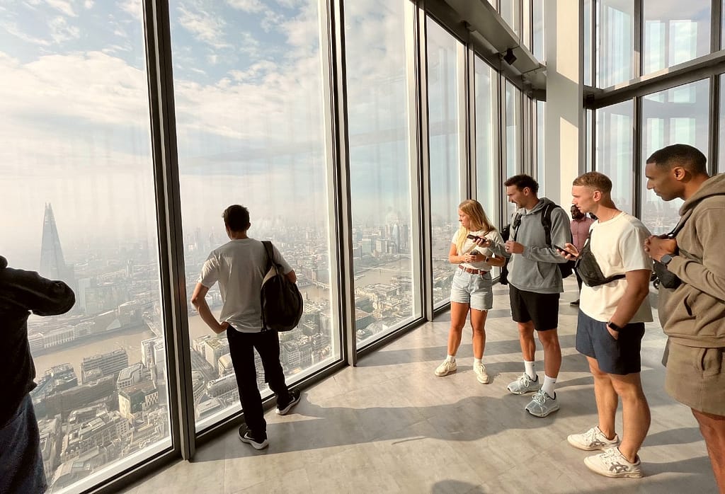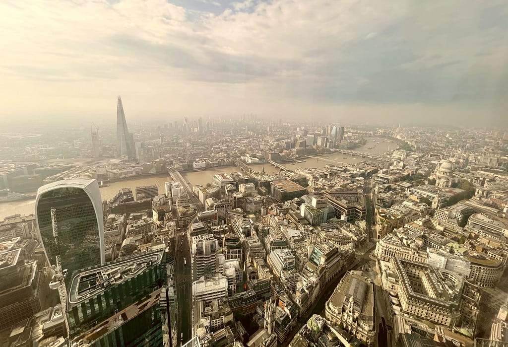 Horizon 22 is London’s highest viewing platform and it’s FREE! Unlike the nearby Shard platform though, this one is only open in the daytime. Booking in advance is advised via the Horizon 22 website, but if you haven’t booked you can still walk up on the day and scan a QR code for entry. Places are reserved for this and you’ll be allocated a ticket time if there is one available. We did this and were granted immediate entry, but sometimes you may have to wait a while. Entrance is via separate doors to the offices in the building and you’ll then be guided to high speed elevator to reach the viewing platform. As you come down the stairs and see a huge wall of windows, it becomes clear you’re in for a real treat.